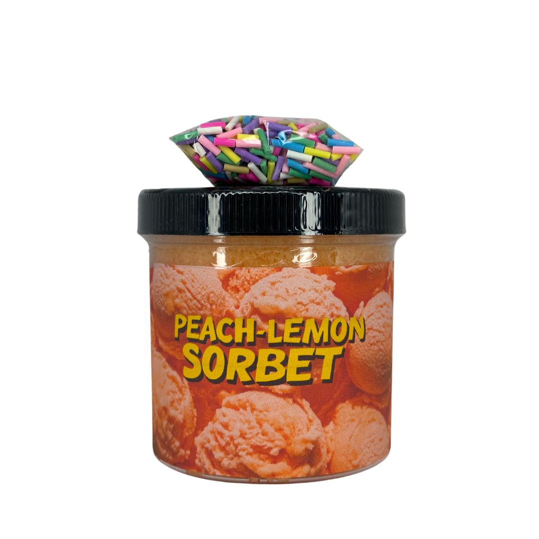 Zesty, sweet, and delightfully smooth! Our Lemon-Peach Sorbet slime is a peach-colored snow slime with a refreshing blend of lemon and peach scents, topped with sprinkles for a fun finishing touch.